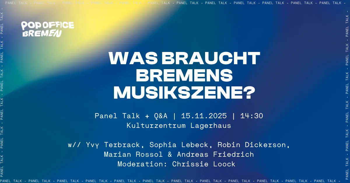 Auf dem Panel diskutieren Marian Rossol (Bremen Vier & Bremen NEXT), Sophia Lebeck (Bookerin), Yvy Terbrack (Musikerin HB), Robin Dickerson (Musiker BHV) und Andreas Friedrich (Veranstalter in HB und BHV). Moderiert wird der Talk von Chrissie Loock.