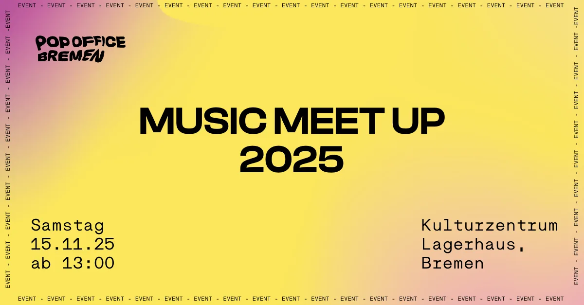 Am 15.11.25 laden wir euch zum Music Meet ᵁᴾ 2025 ein — der Musikkonferenz für die lokale Musikszene im Bundesland Bremen. Es wird ein spannendes Programm mit viel popkulturellem und politischem Diskurs, einem hilfreichen Workshop, Vorträgen und Vernetzungsmöglichkeiten und natürlich Musik aus dem besten Bundesland der Welt.